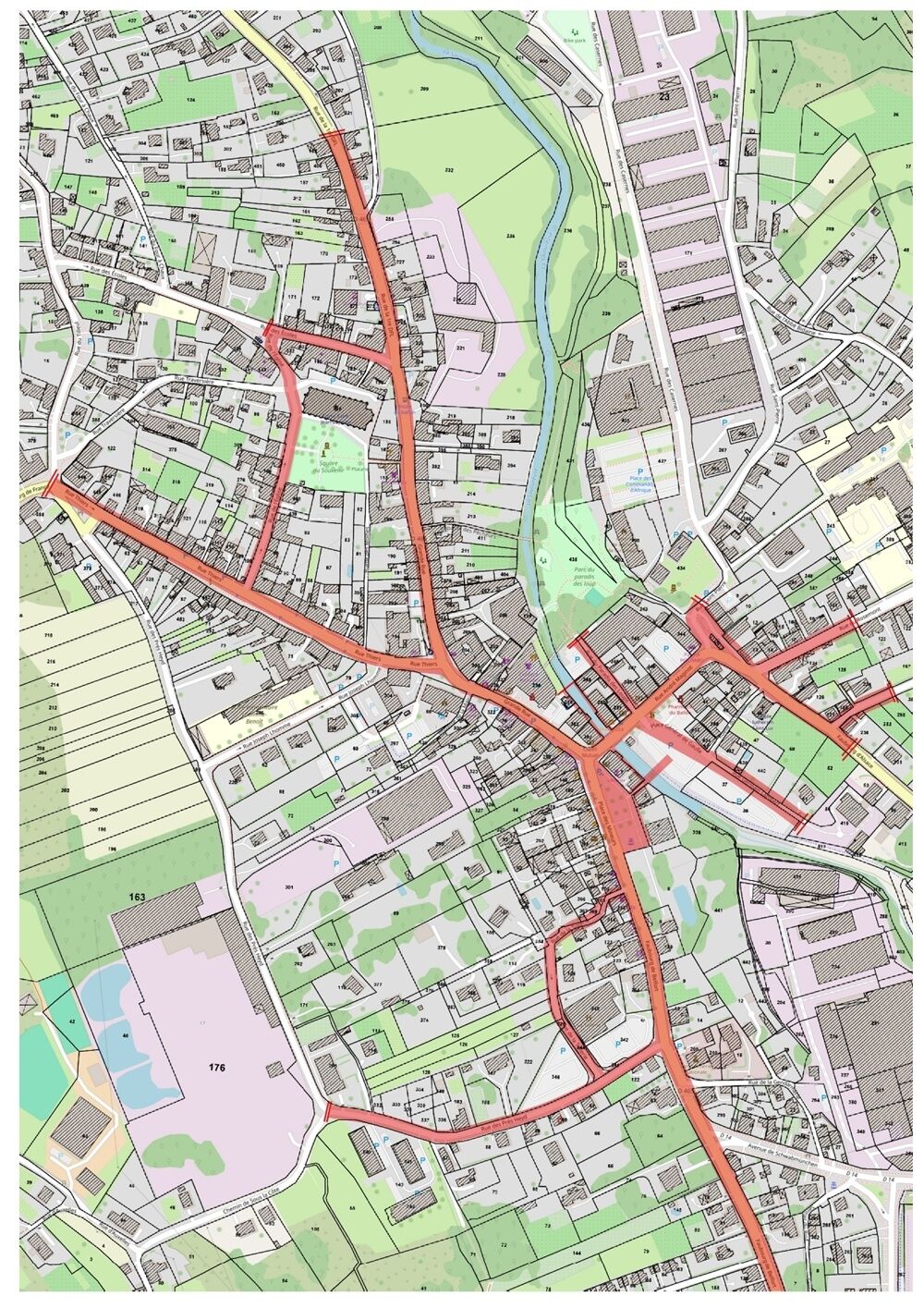 Zones entrantes dans le nouveau périmètre le centre et la fontaine, le haut de la rue Thiers, les abords du temple, la place de Gaulle, la partie de la rue de la 1er DFL côté Lepuix, et le faubourg de France depuis l’entrée sud de la ville.